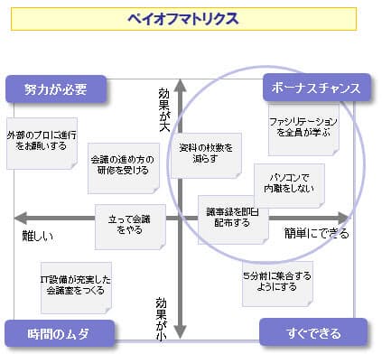 「効果」と「実現性」の2つの軸で区切られた図(マトリクス)を使い、効率的にアイデアの取捨選択をするための分析フレームワーク